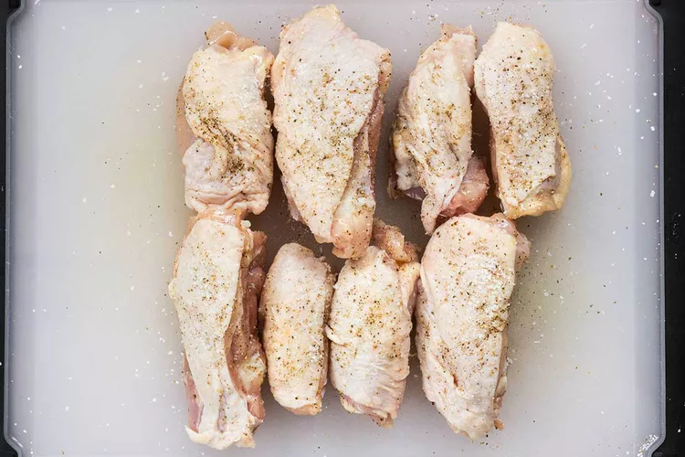 Cut each thigh in half along the bone; the pieces will be uneven in size with the bone in one half. Sprinkle the chicken all over with salt and pepper.