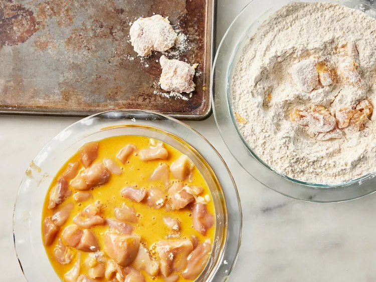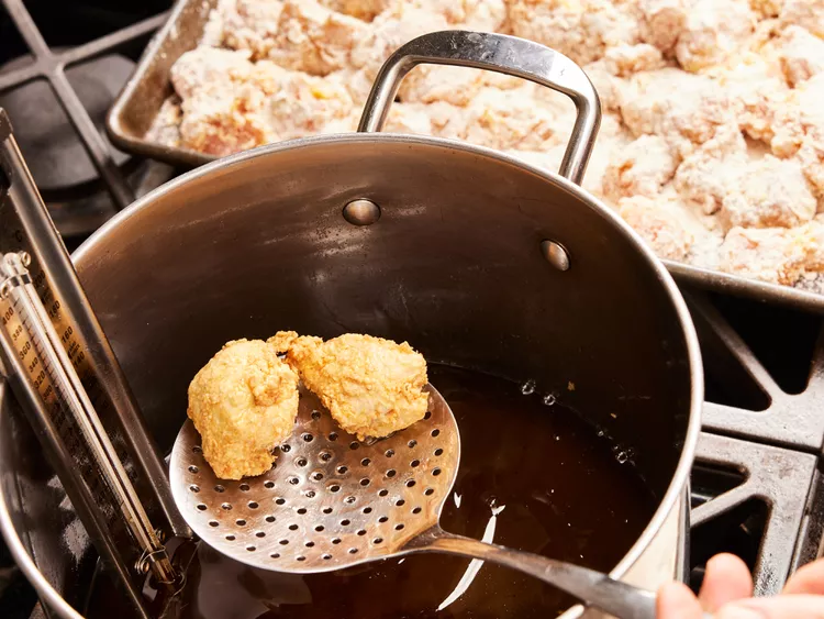 Working in batches, fry chicken in hot oil until golden brown and no longer pink in the center.