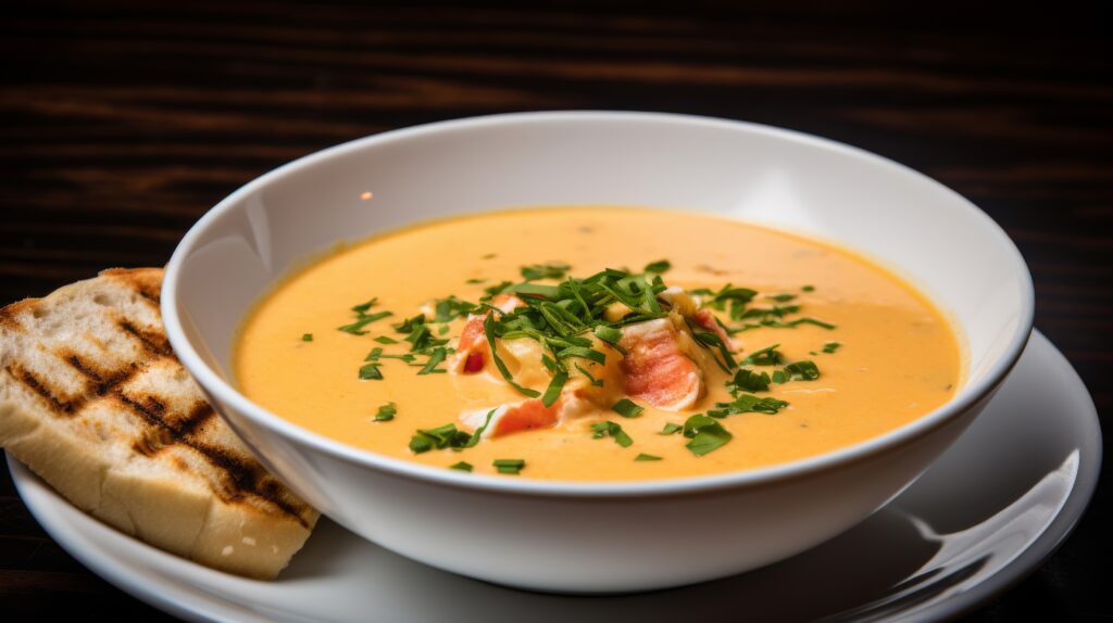 Lobster soup is a rich and flavorful dish made from fresh lobster, aromatic vegetables, and a creamy or tomato-based broth. The shells are often used to prepare a deep, savory stock that enhances the soup’s taste. Tender lobster meat is added at the end to preserve its texture and sweetness. This elegant soup is often served as a starter or special occasion dish, offering a luxurious blend of seafood flavor and smooth, comforting warmth.